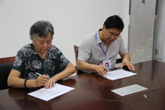 图书馆馆长韩富贵与谢照明家人在捐赠图书登记册上签字。